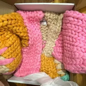 Hope Macaulay Athena Colossal Knit cardigan. Size S/M. It is made using candy pink, yellow, golden yellow, and cream vegan biodegradable nylon. Designed and handmade in Northern Ireland. Worn once very briefly. Will be shipped in original box/packaging.