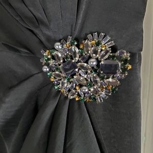 BCBG MAX AZRIA black strapless side drape gown, w/ jewelled accent at waist line