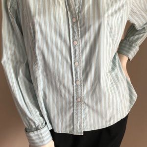 collared button down striped multi color career wear french cuffs aqua turquoise white light blue straight hem hidden buttons gap vintage