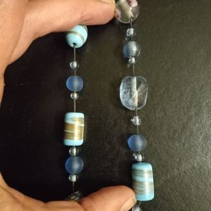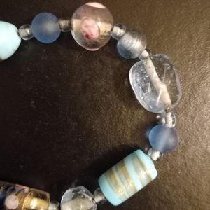 Vintage Murano art glass stretch bracelet is a variety of blue and white glass beads. Can be worn on its own or with other bracelets.