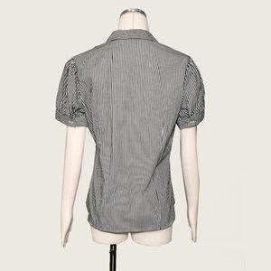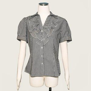Harve Benard White/Grey Pinstripe Blouse with Ruffle. 100% Cotton - Size L. Measurements: Length 23"/Pit-to-Pit 21". In excellent condition. No defects.