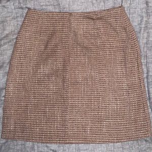 Brown tweed mini skirt with an A-Line style, high rise bodycon fit, and zip closure on the back. Skirt is fully lined.
