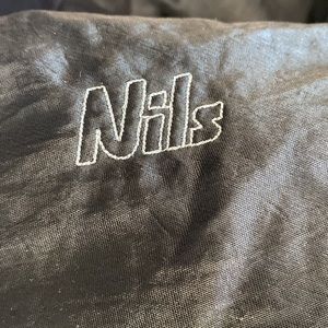 Vintage 1990 black textured satin one piece ski suit from Nils. Sz 10