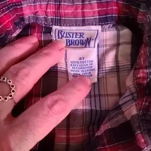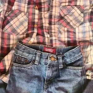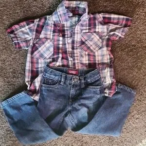 This is a super cute toddler outfit set. Levis 511 skinny jeans size 3T no holes or stains with a super cute Buster Brown plaid short sleeve button down shirt size 4T. This is the perfect fall outfit. These are like new with no signs of wear.