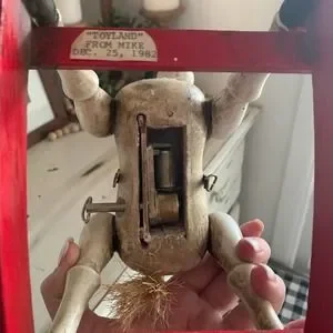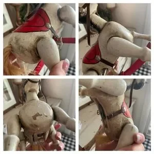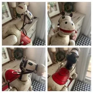 Vintage 1979 enesco wooden carved painted rocking horse with straw tail and leather bridal/stirrups/ears. Plays “Toyland”! Gorgeous for a nursery, or Christmas decoration. This item is VINTAGE and in OK condition, it still plays, the music parts are exposed on the bottom. It rocks if you push it too, but the paint is chipped and rubbed off in certain areas. There are also discolorations and a dirty appearance as pictured I cleaned it but this is as good as I got it. PLEASE VIEW ALL PICTURES