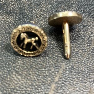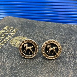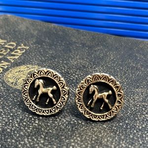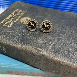 Vintage 70’s horse cufflinks in bronze-gold tone with black enamel detailing. Scalloped etched border. Embossed Arabian horse on front. Toggle cufflink. MEASUREMENTS Diameter: 3/4” Stem: .5” Toggle: .5”