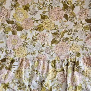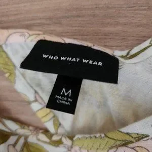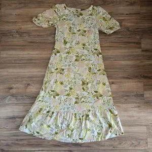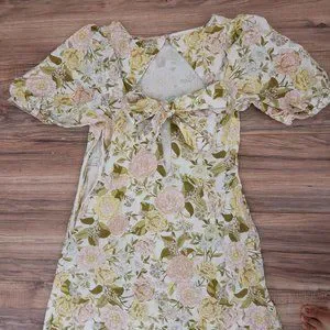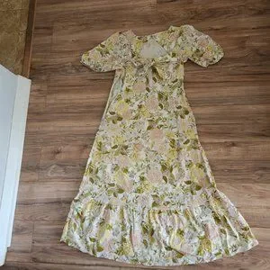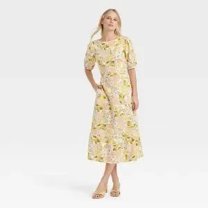 Who what Wear Women's drawing room Floral Bishop elbow Sleeve Tie-Back peasant midi Dress really pretty print on cream background pink and yellow flowers.