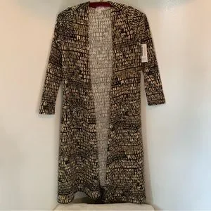 *NWT* LuLaRoe Sarah Long Cardigan Duster. Taupe, Tan and Black abstract print. Open front, long sleeve, hip pockets (yay!). New with tag, never worn, no flaws, see pictures for details.