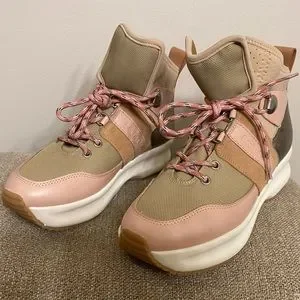Super Cute and comfortable Pink and beige 'Casey' lace-up high-top platform sneakers from See by Chloe. Trimmed with leather. Decorated with a perforation. Logo embossed on the side. Silver-tone inlay and a sewn-on strap at the back. White and tan rubber soles