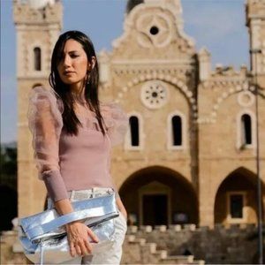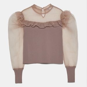 ZARA DUSTY PINK KNIT BANDAGE CHIFFON RUFFLE ORGANZA LONG SLEEVE TOP BLOUSE $69.9