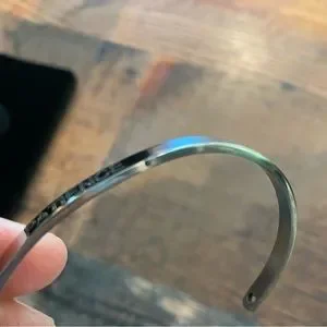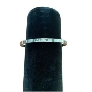 This cuff bracelet is in stainless steel with the encouraging sentiment “Patience”(sometimes we all need that reminder). It has heart cut outs on each end of the cuff. It does have some flexibility to it, but not allot. Probably fits up to a 7.5” wrist the best. Super cute and sturdy. I love these so much that I intend to get more for stackable cuffs. 🎊