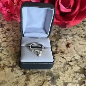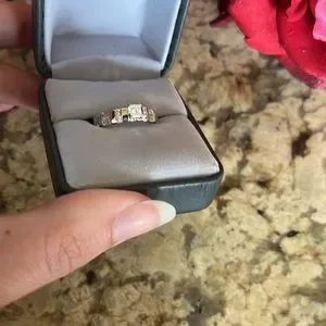 Custom made. Princess cut diamond, in a beautiful setting. Round and baguette diamonds on side. 14 K White Gold. Approximately 5.5 in size. Maybe possible to be sized by jeweler?