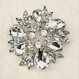 Huge beautiful rhinestone brooch in silvertone metal & set with teardrop shaped & smaller round clear stones.