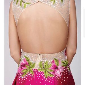 Stunning sleeveless A-line dress features a floral bodice and poly-satin skirt. New with tags in its original bag.