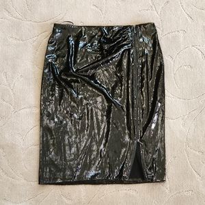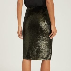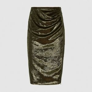 The Leena pencil skirt in green is cut from a metallic velvet to a mid-length with a subtle rouche detailing. Wear it with a satin blouse, barely-there heels and delicate jewelery for a contemporary take on cocktail dressing.
