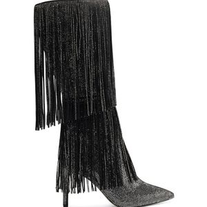 NWT Fringe Rhinestone Beaded Heeled Knee-High Boots Pointed Toe Metallic Boot