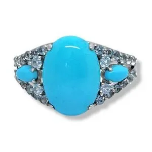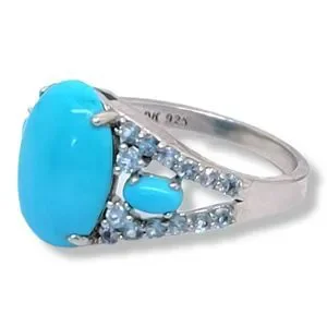 New Sleeping Beauty Turquoise ring. The color, even tone matching side stones are rare. All my Turquoise from the Sleeping Beauty mine is lovely. But the matching Blue Topaz in this piece has a magical way of drawing the eye to the ring and keeping it there. Special occasion ring, this one will become a family heirloom.