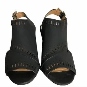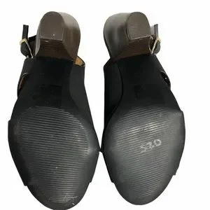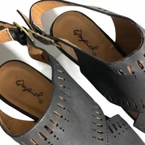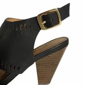 QUPID Slip On Heels w Ankle Strap Blk Sz 5.5 (Approx). No size indication on shoes, however, I wear size 5.5 and it fits me perfectly. See photos for measurements. Chunky wood stacked heels make this a super comfy pair of shoes. Wrap around design with laser cut details.