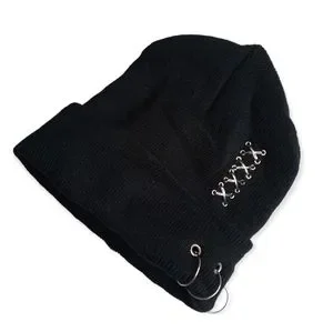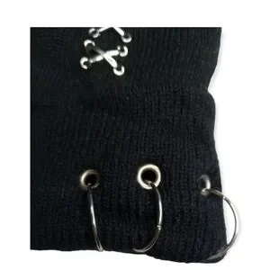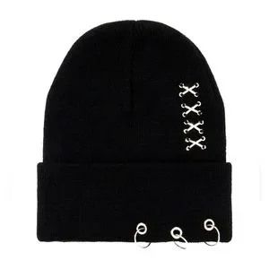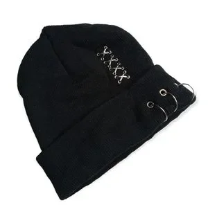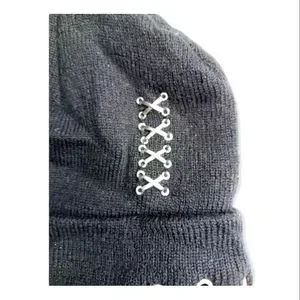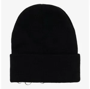 Cold weather but still keep it edgy with Hot Topics pierced beanie black one size featuring silver toned crisscross and o ring detailing.