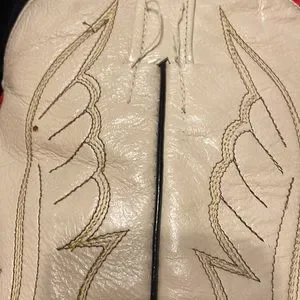 My hubby bought these boots while we were stationed in NM between 1988-1992 . Vintage with flaws but amazing set. He thinks he was a size 9 back then. There are many brown markings that appear to be from age (maybe like yellowing of an old wedding dress) Definitely will be a head turner! Belt snake head is a bit distorted and one eye is missing.