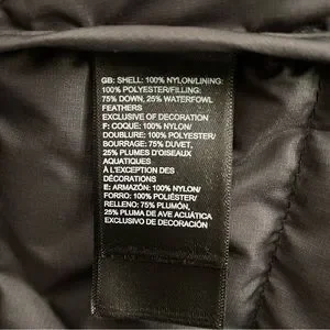 * Shell: 100% Nylon; Lining: 100% Polyester; Insulation: 75% Down 25% Waterfowl Feathers