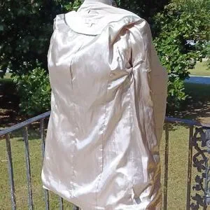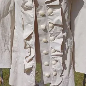 Coat has large double pointed lapels to a minimal collar in back. Front darts for a nice fit. Large ruffles down front with two side front pockets.