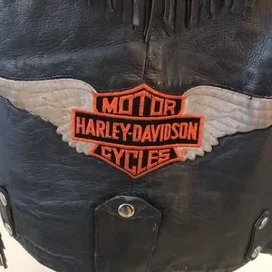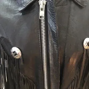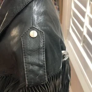 My first leather riding jacket. It’s been everywhere. It’s well worn with lots of scars and stories. All the hardware is present and functional. Fringes are all there and still very supple. Missing the belt. Hole in shoulder as shown from an accident. Harley Davidson patch on back sewn on about 30 years ago. Don’t buy it if you’re wanting a pristine leather jacket, but do buy it if you want a great conversation piece with lots of love.