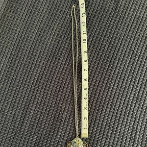 Large silver elephant head necklace with jewel-tone accent colors on the eyes and forehead. Pendant measures approx. 3.25 inches long, and the chain measures approx. 14 inches with a lobster clasp closure, see photos. The pendant and chain are not sterling silver, but silver-colored.