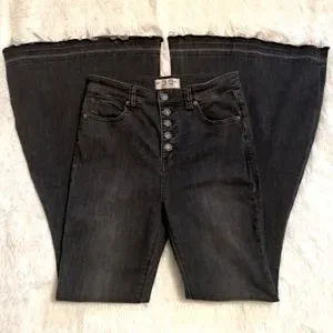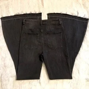 NWOT (washed once but never worn). These hug your figure in all the right ways with them have a sweeping flair silhouette, exposed button fly and raw release hem. The denim is buttery soft and lightweight with these having generous stretch. The color is called Galaxy Black which is more of a vintage black.