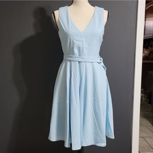 A pretty blue sleeveless fit-and-flare dress features a belted waist, side pockets, and an A-line silhouette for feminine style.