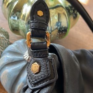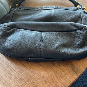 Good used condition. Marc by Marc Jacobs black leather shoulder bag. 12” wide 15” tall from strap. Some wear on brass hardware and minor spots on lining but otherwise great condition.
