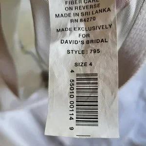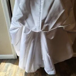 Size 4 . White Satin David's Bridal Michael Angelo wedding dress with train and Thai pickups in back. Detail Crystal and bow at bodice. Fabric covered buttons down entire length of back of dress. Can be worn with a belt I chose not to. Classic Aubrey Hepburn Style. With size 4 David's Bridal A-line under slip.
