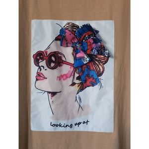 pre owned women's maxi dress with graphics in the middle. mesh sheer fabrics Arm. 95% polyester 5% spandex fabric overall. loose fitted. The hairbands on the graphic are stichted onto the dress, giving it an unique fashionable look.