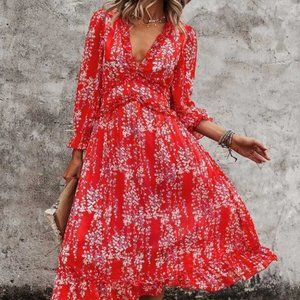 Ditsy Floral printed with Deep V-neck Ruffle Hem Dress