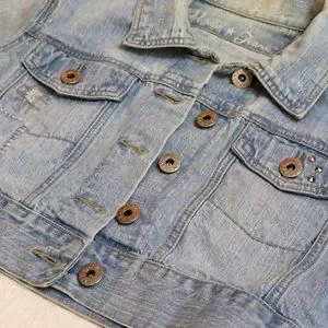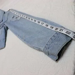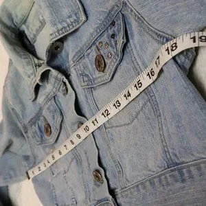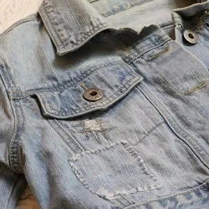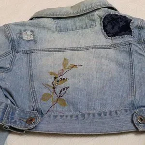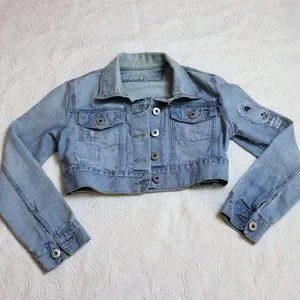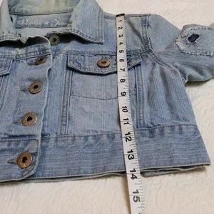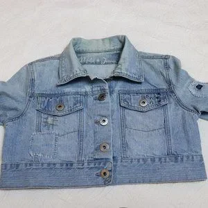 Jean Jacket Jean cropped jacket has embroidery on the back with unique distressed patchwork on jacket. It has adjustable waist buttons. The waist button are about an 1.5" difference to be able to adjust if needed or preferred. It has a light wash appearance with acid distressed look around certain parts of jacket. Overall its in great condition.