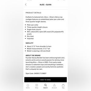 Crafted of a textured knit, Alice + Olivia's Akira crop cardigan features an embellished peter pan collar and three-quarter-length sleeves.