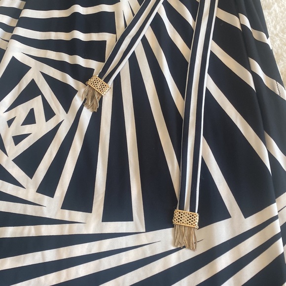 Black & white sleeveless BCBG Maxazria maxi dress. Geometric pattern, side slit, tie waist with gold hardware. Excellent used condition