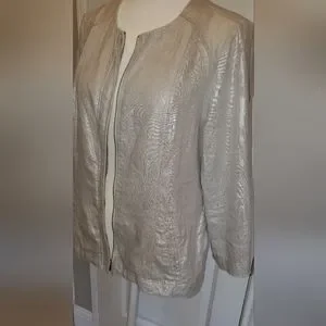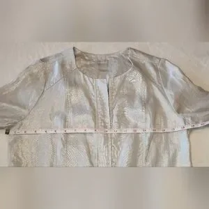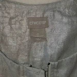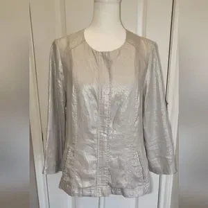 Beautiful lightweight zip front 100% linen jacket. Silver metallic grey with pockets, 3/4 length boyfriend sleeves. This metallic thread linen has slight sheen and some slubs which are natural to the fabric construction. Silver hardware. Good used condition. Measurements in photos, Chico's size 0 (4/6).