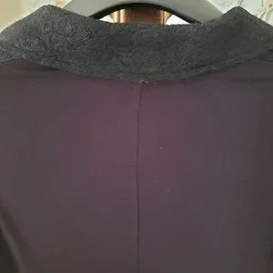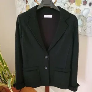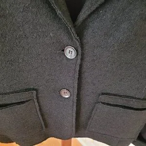 This beautiful jacket is a twist on basic black! With a boiled wool front and a jersey feel (rayon/viscose) back, this piece can be worn as a blazer or as a light fall jacket. It features front pockets and a two button closure, and the sleeves can be worn up or cuffed (they can also be pushed up due to the mix of fabrics). In excellent preloved condition from a smoke free and pet free home.