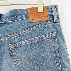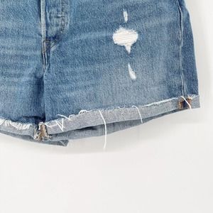 Levi's Premium 501 Long Short Highways & Byways Distressed Button Fly Denim Jean Shorts Sz 30 Blue Pockets Cuffed Hem
