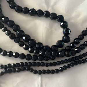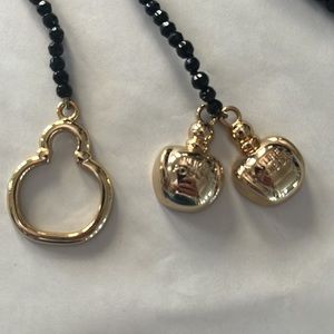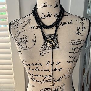 NIB Dior Parfums long beaded wrap necklace/belt. Graduated black faceted glass beads can be wrapped multiple times. From end to end including the charms on the ends, 86 inches long. No scratches or flaws. Never worn. Comes with original silk pouch and box. Please see all pics.