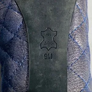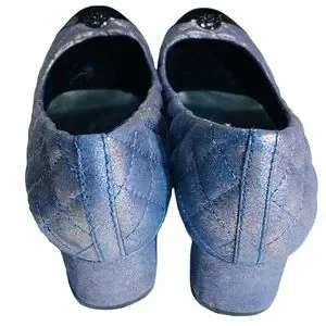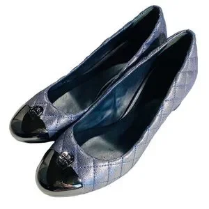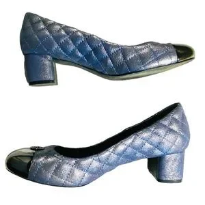 Tory Burch Kaitlin Quilted Cap Toe Navy Blue Metallic Pump Block Heel Size 9 M.