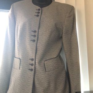 2pc ladies suit size 10. Lined Jacket has 9 button front with black trim faux pockets. Box pleated. Skirt is unlined . Gently used@, great fall or early spring suit- by Gilmor black & white tweed “like” pattern. Dry Clean