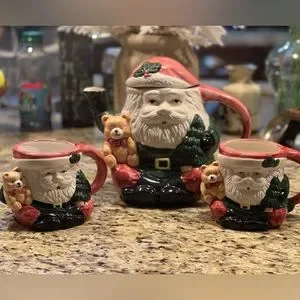 New in box Santa tea pot and 2 matching mugs