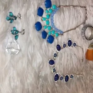 9 necklaces total, the 3 on the fur needs to be fixed including the silver bracelet( still wearable) two sets of earrings and a gold color bangle.