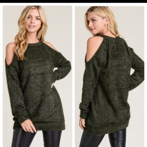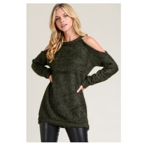 **SOLD**COLD-SHOULDER FUZZY SWEATER-DARK OLIVE