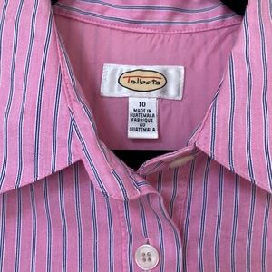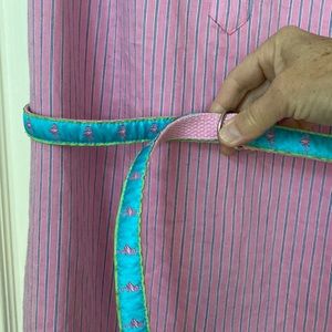 Preppy dress. Pink and blue pinstripe. Flamingo belt at waist. Fully lined. 19 inches from armpit to armpit, 20 inches at hips. 39 inches long.
