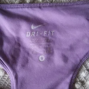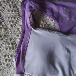 white and purple dri fit top sz sm. has extra cups sewn in for more coverage. 2 small pin prick holes on back reflected in price.