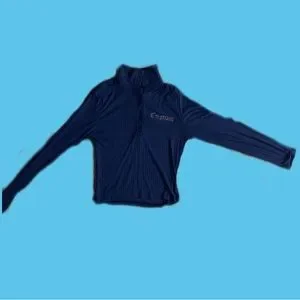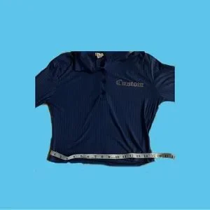 Blue crop top, tight fitting sleeves. With collar and buttons, says custom on it with diamonds. Worn and still in good condition :) 💚