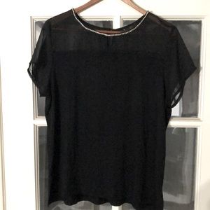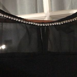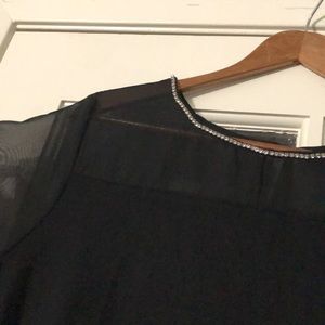 NWOT never worn excellent condition jersey black top with sheer short sleeved and neckline. Linear keyhole in from and back. Back has a single button closure. Rhinestone neckline, no stones missing